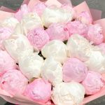 Лента атласная – 1 шт.Упаковка дизайнерская – 9 шт.пион пиллоу толк – 15 шт.пион мадам клод тейн белый – 10 шт.