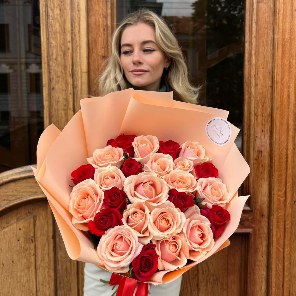 Роза красная 60 см – 12 шт.роза персиковая 60 см – 13 шт.Тишью – 1 шт.Дизайнерская упаковка – 3 шт.Лента атласная – 1 шт.