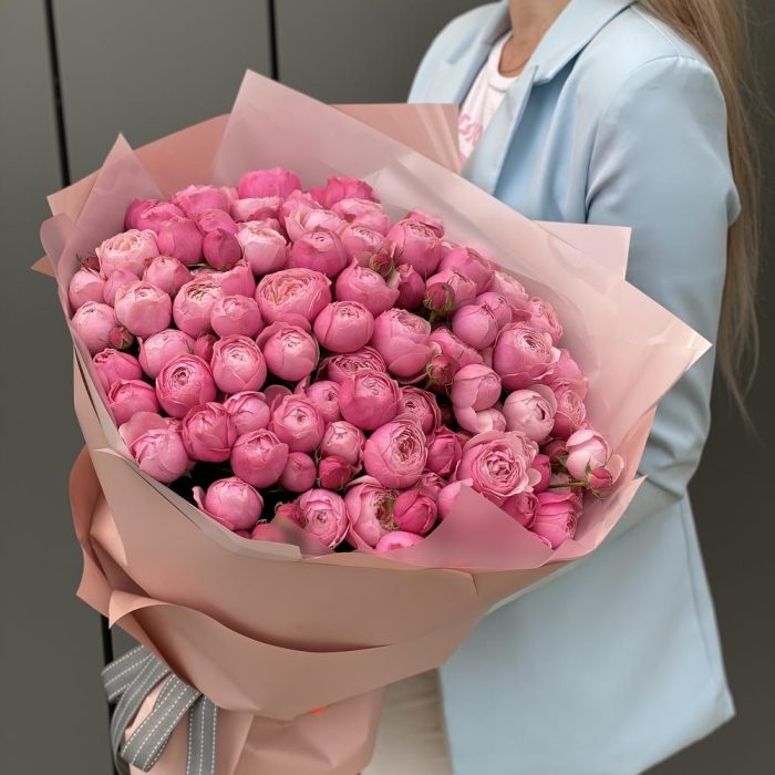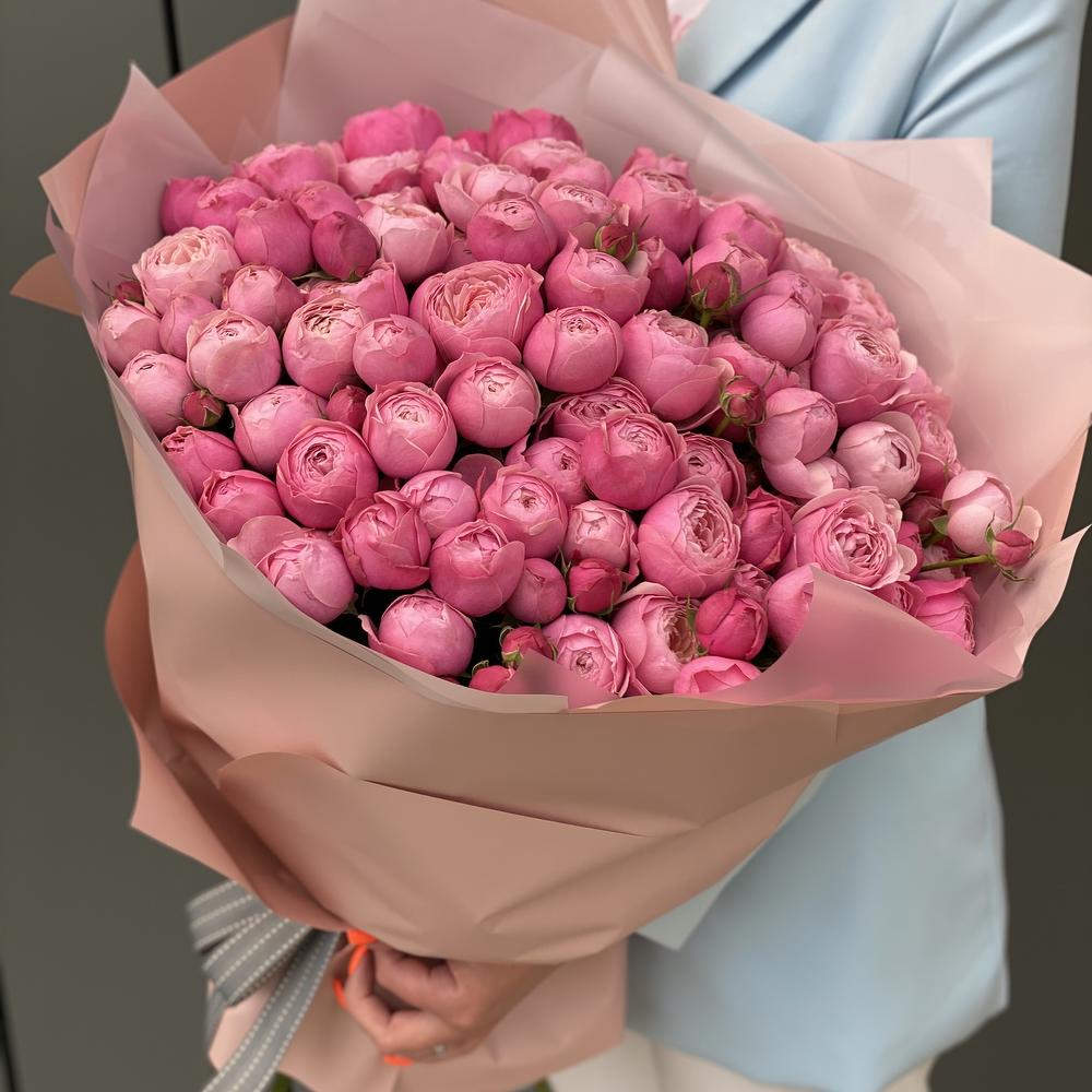кустовая пионовидная роза сильвия пинк – 35 шт. Писташ – 7 шт. Оформление – 1 шт.