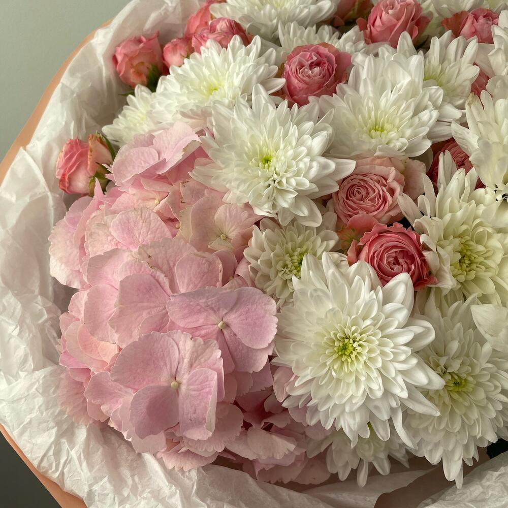 Гортензия – 1 шт.Хризантема кустовая – 4 шт.Кустовая роза – 3 шт.Тишью – 1 шт.Пленка дизайнерская – 1 шт.Лента атласная – 1 шт.