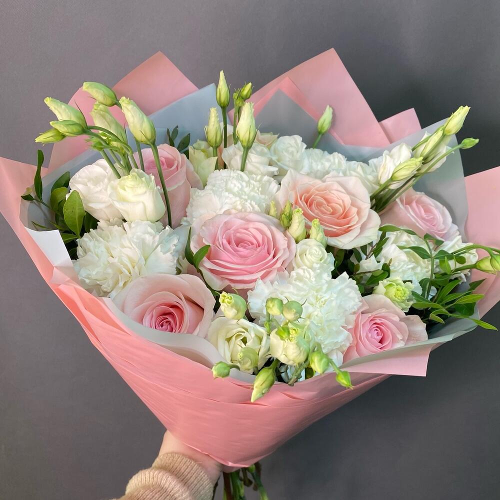 Роза Эквадор – 7 шт.Диантус – 5 шт.Эустома – 4 шт.Упаковка дизайнерская – 3 шт.