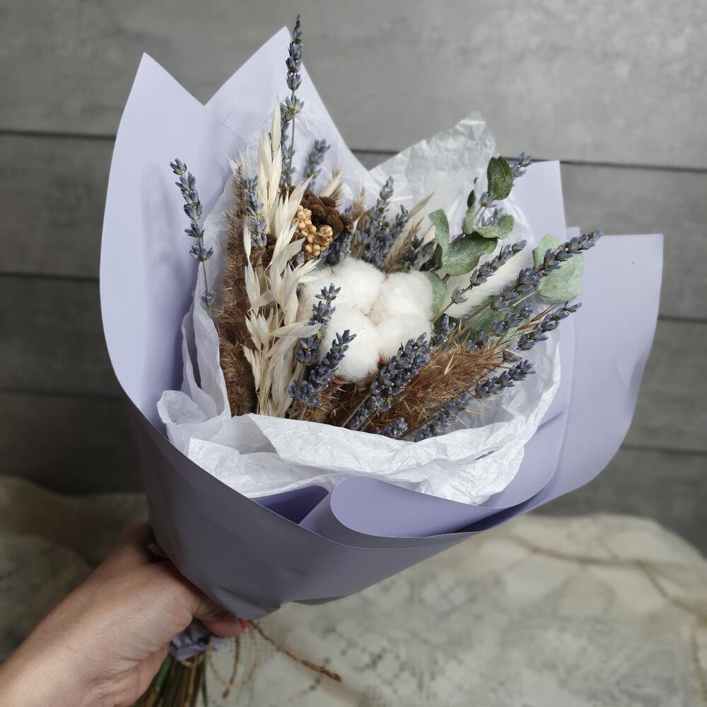 Танацетум – 1 шт.Упаковка дизайнерская – 1 шт.Хлопок натуральный – 1 шт.Лагурус (сухоцвет) – 3 шт.Эвкалипт сухоцвет – 1 шт.овес сухоцвет – 2 шт.сорго – 1 шт.лавандин пучок – 1 шт.камыш декоративный пучок – 1 шт.