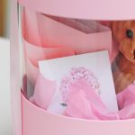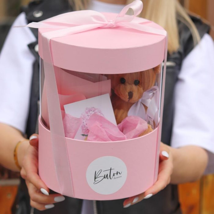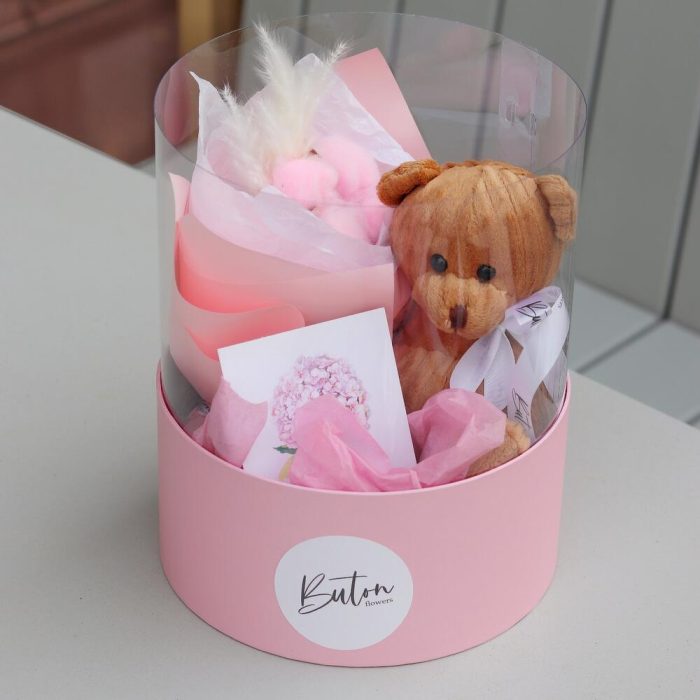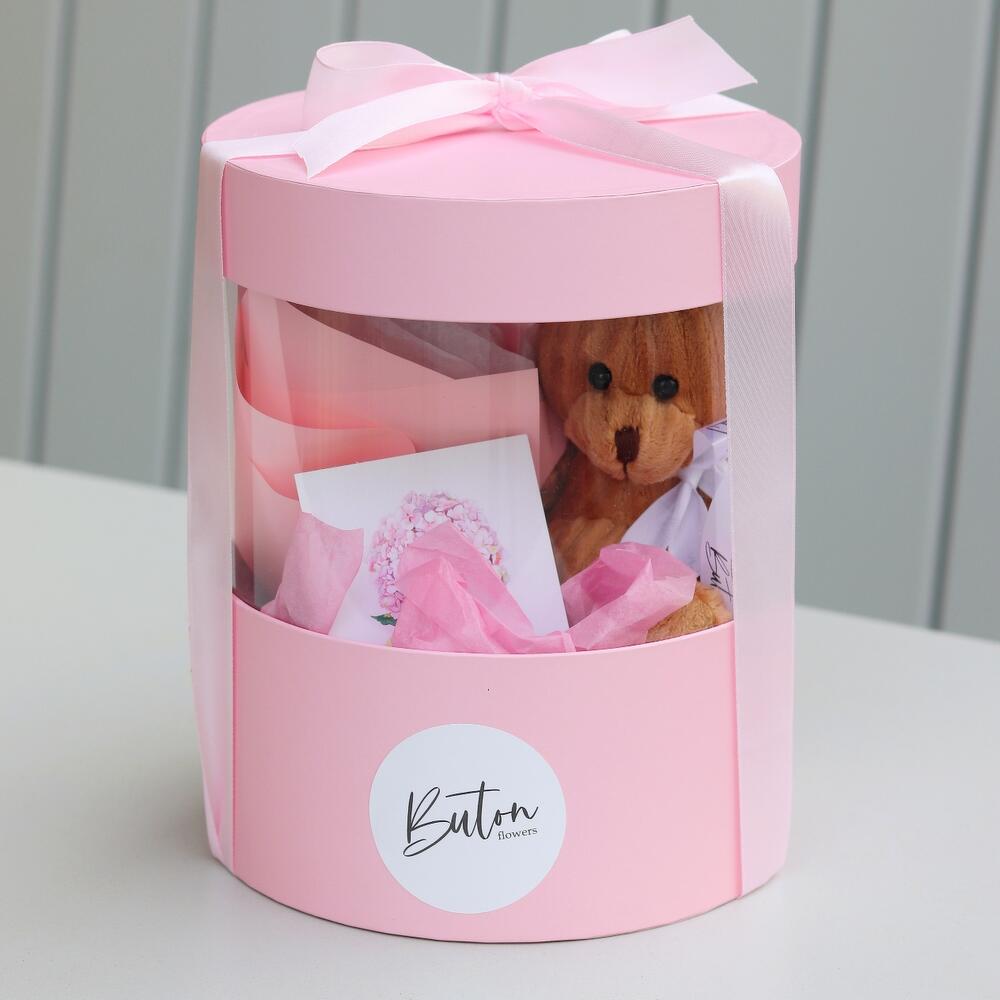 Лента атласная – 1 шт.Тишью – 1 шт.Шляпная коробка – 1 шт.Мишка плюшевый – 1 шт.Открыточка с вашими пожеланиями – 1 шт.шоколадка – комплимент для получательницы от нашей мастерской – 1 шт.букет из сухоцветов (хлопок – 1 шт.сетария) – 1 шт.
